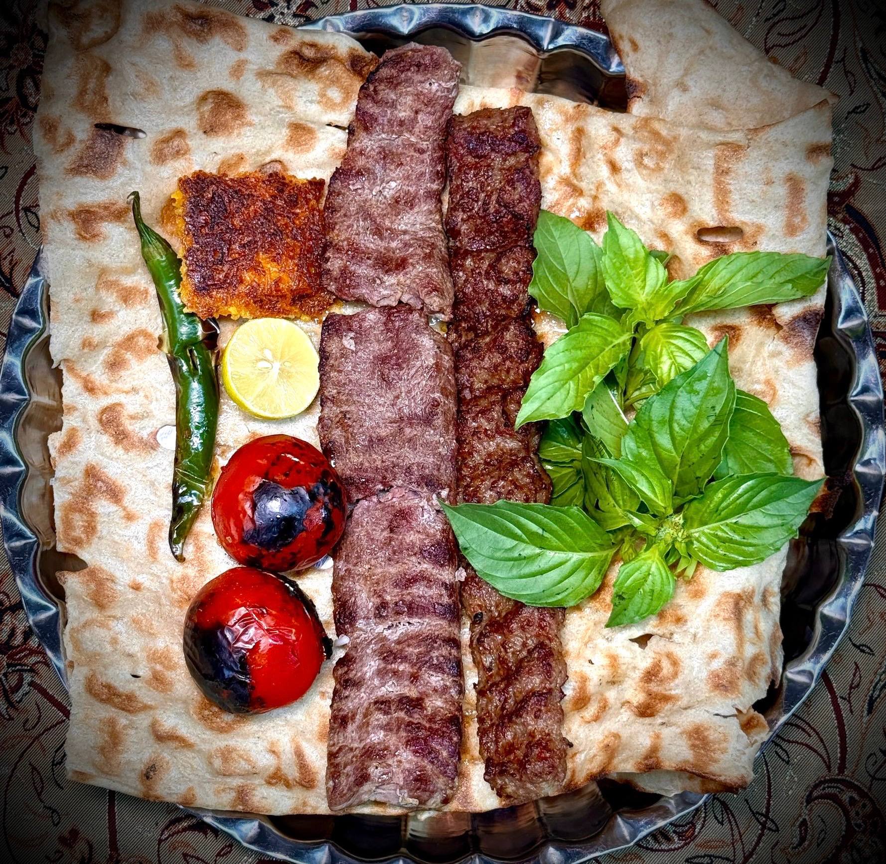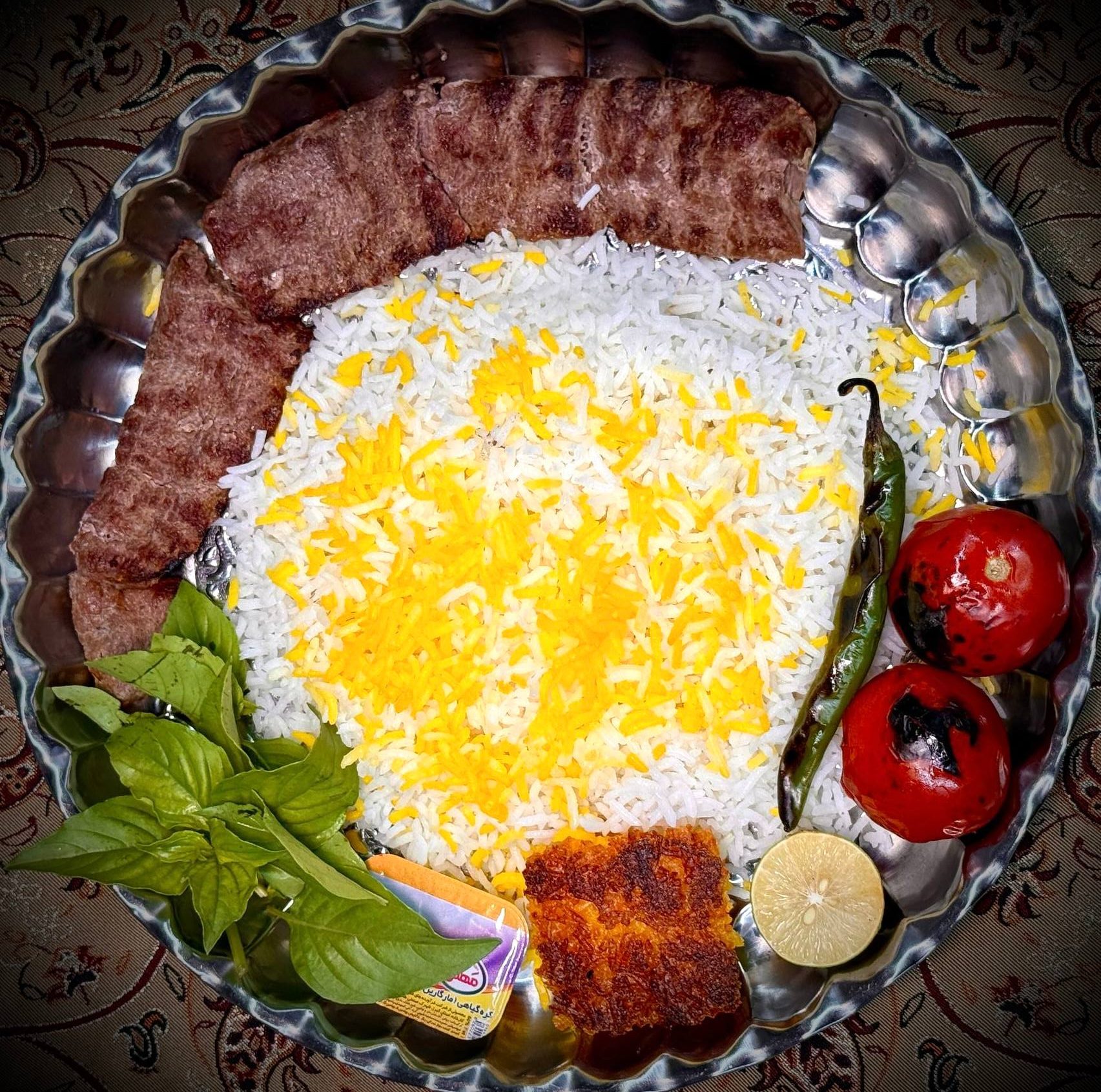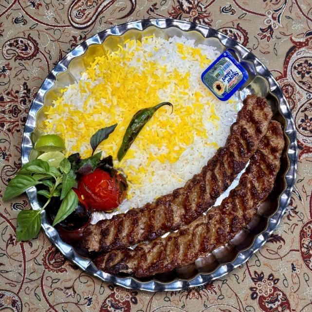 ۲ سیخ کباب کوبیده مخلوط گوشت گوساله و گوسفندی ۱۰۰ گرمی، ۳۵۰ گرم برنج ایرانی، گوجه کبابی، کره