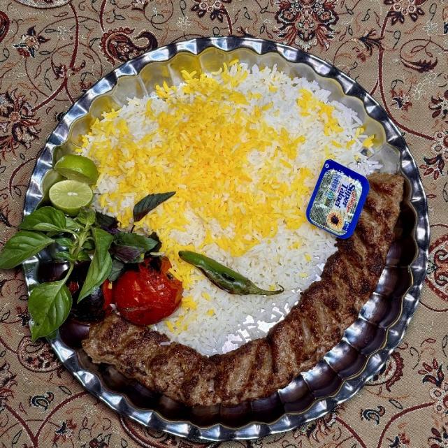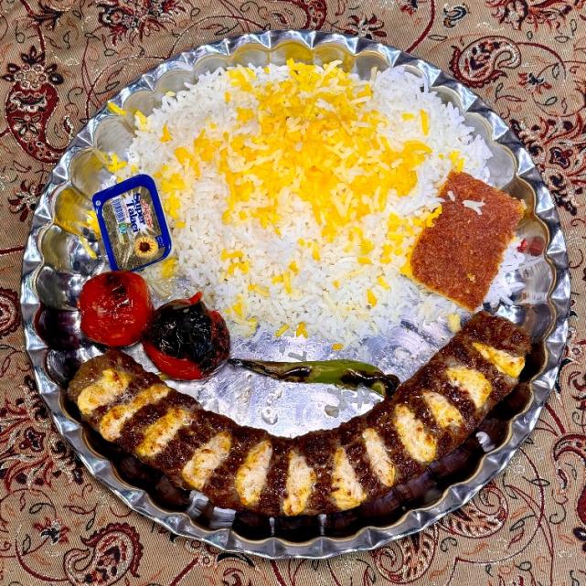 یک سیخ کباب کوبیده مخلوط گوشت گوساله و گوسفندی ۱۴۰ گرمی، ۳۵۰ گرم برنج ایرانی، گوجه کبابی، کره
