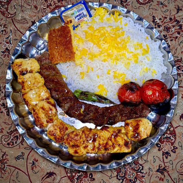 یک سیخ کباب کوبیده مخلوط گوشت گوساله و گوسفندی ۱۴۰ گرمی، ۶۰ گرم سینه مرغ نگینی، ۳۵۰ گرم برنج ایرانی، گوجه کبابی، کره