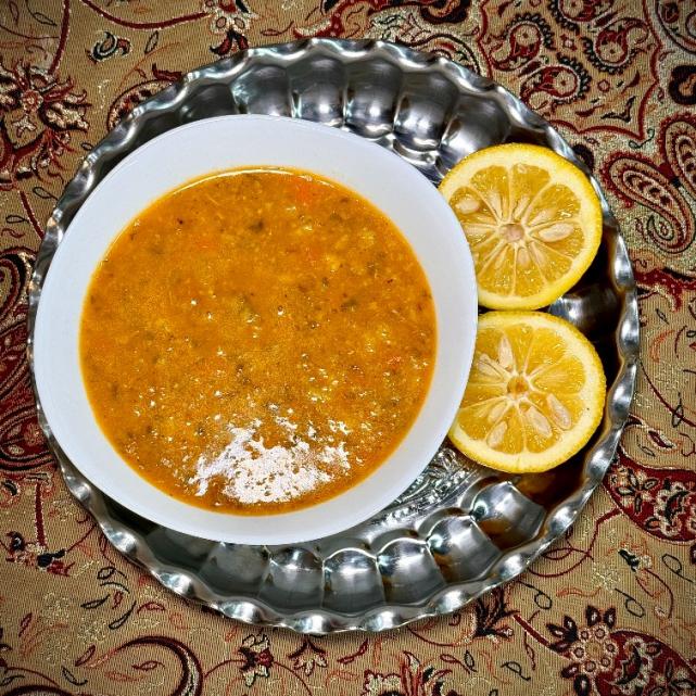 آش شله قلمکار با گوشت مخلوط گوساله و گوسفندی، سبزی آش، گندم، حبوبات، تزیین شده با پیاز داغ، نعنا داغ، ارائه در ظرف بهداشتی