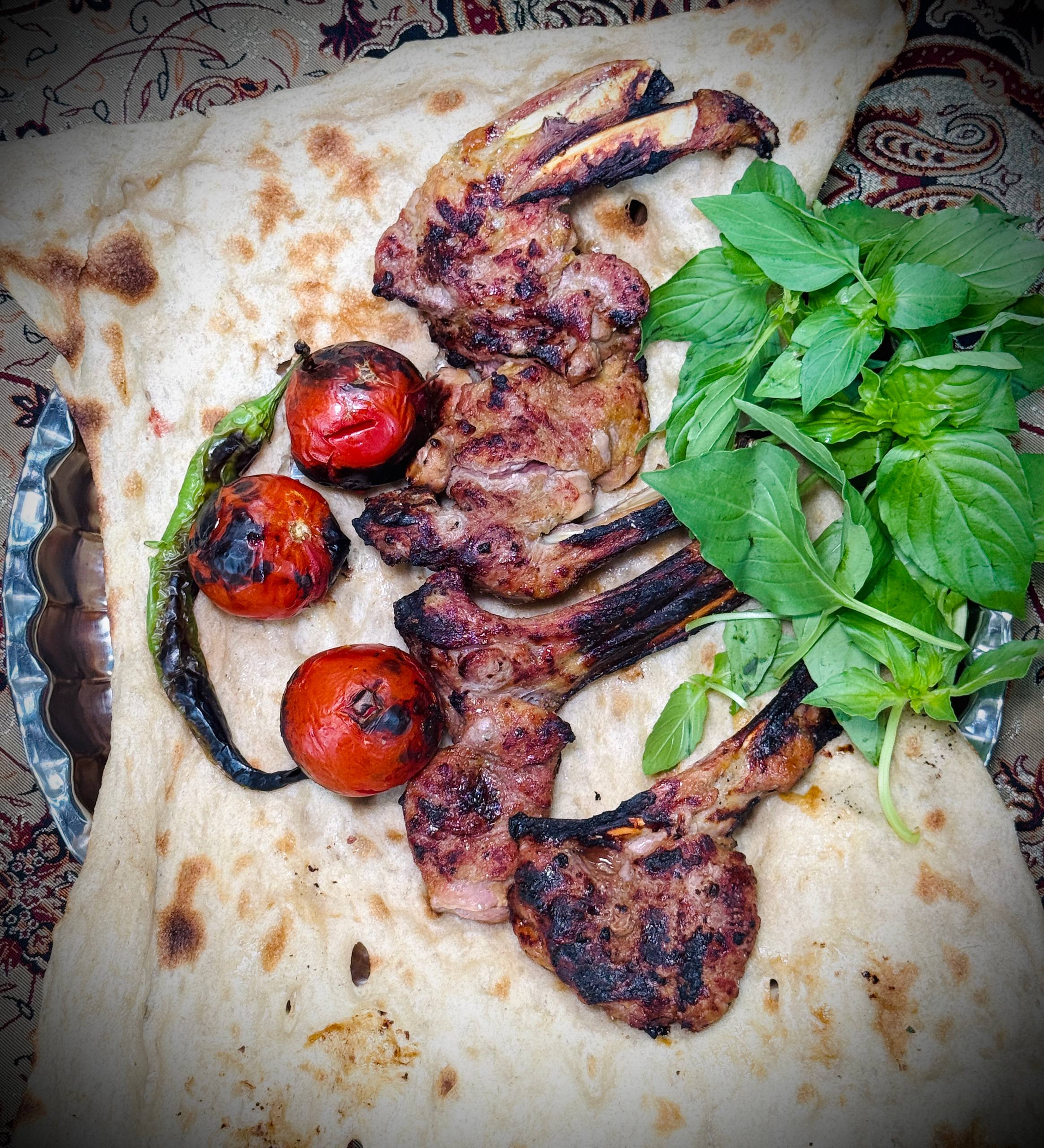 یک سیخ، کباب دنده گوسفندی 400 گرمی، دورچین: گوجه کبابی، فلفل کبابی، سبزی، به همراه یک تکه نان سنگک